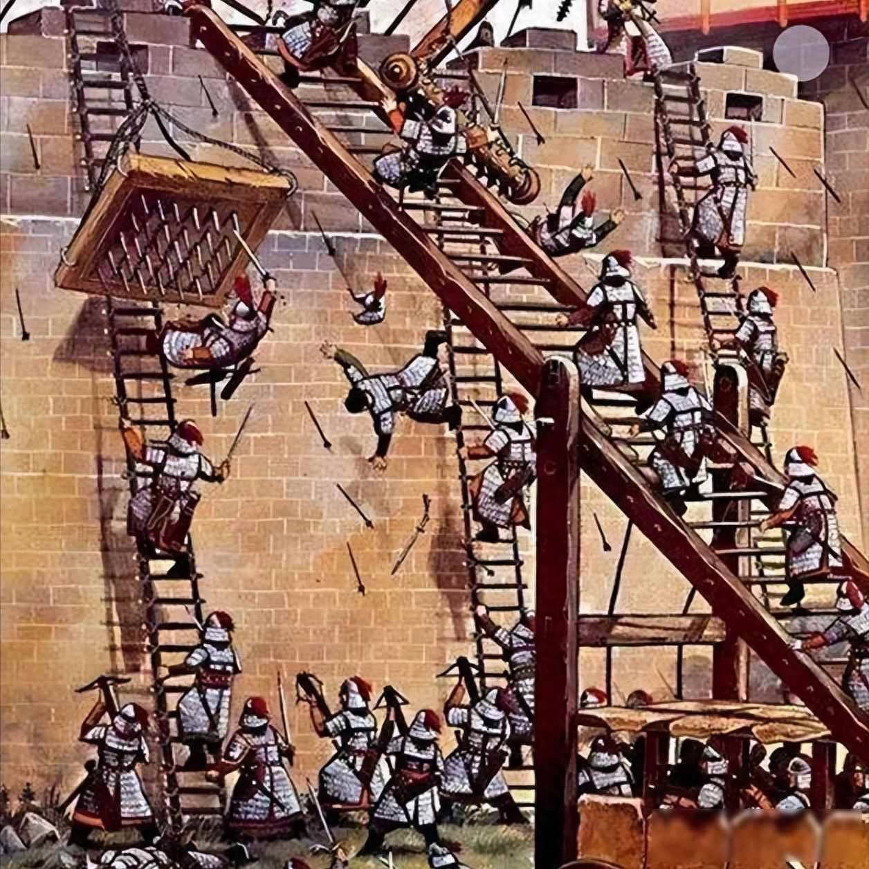 攻城的一方后来用了带云梯的木头战车,推到城墙边时,守军就算一起推梯子,也被车体挡住了,更麻烦的是,车前面的兵能躲在车后头慢慢靠近城墙,守军得一边防着人往上爬,一边躲头顶的箭,手里能用的,只剩石头了。